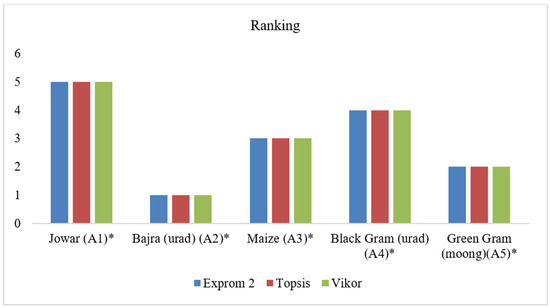 The attributes and the criteria were kept in mind while formulating and modeling the problems. The results obtained by TOPSIS, Exprom2, and VIKOR were in good agreement for prioritizing the kharif crops. The first ranked crop is Pennisetum glaucum, the second is Vigna radiate, the third is Zea mays, the fourth is Vigna mungo, and the last one (fifth) is Sorghum. Results from the three MADM techniques are in exact confirmation indicating that any one of them may be used to rank the crops. The scope of the study may be global and the selected criteria may be increased as suitable. The outcome of the research work will help the policymakers and the farmers to implement sustainable farming practices, increase profit, and minimize losses due to poor decision making. Similar studies may be done changing the criteria, depending on the region and the best productive crop may be suggested to the farmers. The sensitivity analysis of the three methods validates that the PCF and PC are dominant criteria and Pennisetum glaucum emerged as the first ranked crop on maximum counts in the sensitivity analysis of each method. If the government of India motivates the farmers to cultivate this crop in Rajasthan, the productivity is expected to increase.