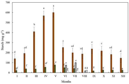 Starch content in bulbs (brown bars), expanded leaves (green bars), scapes (dashed bars), and petals (white bars) of Pancratium maritimum, from January (Ι) to December (ΧΙΙ). Each column denotes means of five replicates ± Standard Error; Standard Errors smaller than the line thickness of the columns are not shown. Significant differences (p ≤ 0.05) of mean values are presented by different lowercase letters (a–g) on bars.