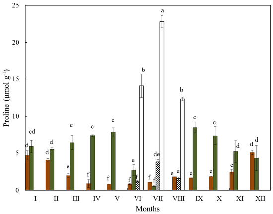 Proline content in bulbs (brown bars), expanded leaves (green bars), scapes (dashed bars), and petals (white bars) of Pancratium maritimum, from January (I) to December (XII). Each column denotes means of five replicates ± Standard Error; Standard Errors smaller than the line thickness of the columns are not shown. Significant differences (p ≤ 0.05) of mean values are presented by different lowercase letters (a–f) on bars.
