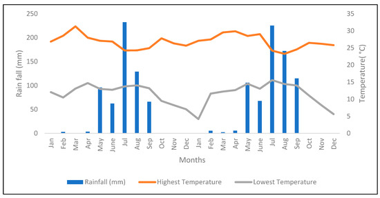 The study was conducted in Bishoftu, Ethiopia (008°47′20′′ N and 038°59′15′′ E), over a 21-month period, from May 2016 to January 2018. The altitude of Bishoftu is 1890 meters above sea level with an Alfisol soil type. The monthly precipitation and temperature for the harvest period of 2016 to 2017 are provided in Figure 1. During the dry periods, plants were supplemented with water by sprinkler irrigation.