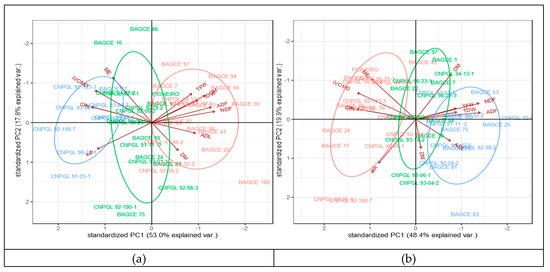 In order to understand the variation between genotypes and the correlation between traits, a pattern analysis was performed to depict patterns of genotypes using forage biomass and feed quality traits across the wet and dry season harvests (Figure 2; Table 6 and Figure A1, Appendix B). The biplot from the pattern analysis revealed that the first two principal components explain 70.8% and 68.3% of the total variation during the wet and dry season harvests, respectively (Figure 2). The first component (PC1) accounted for 53.0% and 48.4% of the total variation in the wet and dry season harvests, respectively. Of the different traits, CP and N were the main contributors during the wet season, while NDF and ADF were the main contributors during the dry season. The second component (PC2), mainly associated with DM, IVOMD, and ME, accounted for 17.8% and 19.9% of the total variation in the wet and dry season harvests, respectively. The biplot analyses revealed three cluster groups where genotypes in the first group are high in CP, IVOMD, and ME, while genotypes in the second group are high in TFW, TDW, NDF, and ADF, indicating that these groups of genotypes differ in their feed qualities and biomass yield. The genotypes in the third cluster were distributed between the two groups. For example, genotypes BAGCE 94, BAGCE 100, and CNPGL 94-13-1 are clustered in a group that performed best for forage biomass yield and were also high for fiber components, while CNPGL 92-133-3, CNPGL 00-1-1, and CNPGL 94-07-2 were clustered in a group that showed the lowest in IVOMD, ME, and CP percentages in both seasons, although this was associated with a lower biomass yield (Figure 2).