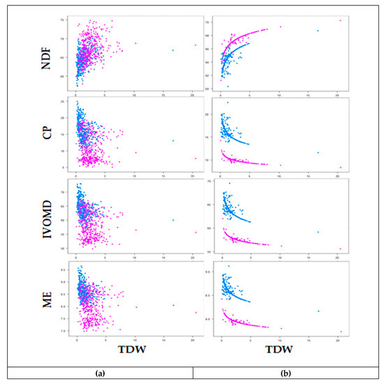 Relationship between neutral detergent fibre (NDF), crude protein (CP), invitro organic matter digestibility (IVOMD) and metabolizable energy (ME) with total dry weight (TDW) of 45 Napier grass genotypes during wet season (purple) and dry season (blue) harvests of observed data (a) and fitted data using allometric relationship (b) under Bishoftu, Ethiopia. Feed quality traits are expressed on dry matter bases (%DM) and TDW is expressed in (t/ha).