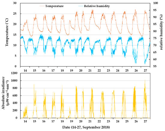 The temperature, relative humidity and solar radiation in the glasshouse during the experiment duration (14–27 September 2018).