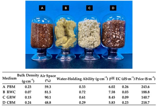 Physical morphology, physicochemical property, and cost of the four common propagation media in South Korea. (A) A peat moss-based mixture (PBM); (B) rockwool cube (RWC); (C) granular rockwool (GRW); (D) a coir-based mixture (CBM).