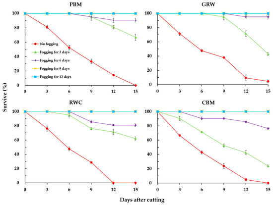 To show the survival percentage changes over time in different media more clearly, changes in survival were recorded in Figure 4 and Figure 5 for each strawberry cultivar. The only exception was in GRW, where a few strawberry ‘Seolhyang’ daughter plants survived without fogging, but they were all in a poor condition. Fogging for 9 or 12 days could guarantee a 100% survival percentage of plants grown in any of the four media. However, the plants grown with 3 or 6 days fogging treatments were dying after the fogging stopped. Without fogging, dead plants were found at every inspection time until almost all of them died.