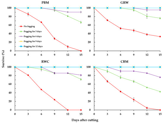 The effects of the growth medium on the survival percentage of daughter plants of strawberry ‘Maehyang’ with 0, 3, 6, 9 and 12 days fogging treatments. Error bars represent the SEs of the three observation units (n = 3). PBM, a peat moss-based mixture; RWC, rockwool cube; GRW, granular rockwool; and CBM, a coir-based mixture.