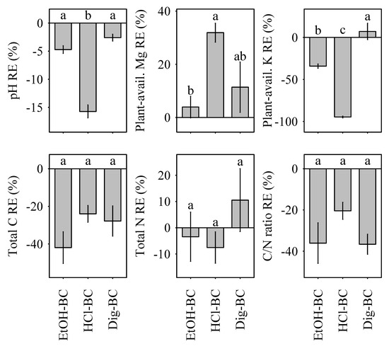 Relative effects (RE, %) of biochar modification on soil pH, total carbon, total nitrogen, plant-available magnesium, and plant-available potassium relative to the non-modified NM-BC. Different lower case letters indicate significant differences (p < 0.05) between biochar modification effects, namely EtOH-BC, HCl-BC and Dig-BC. Data is shown as means with standard error (n = 24).