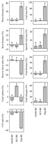 Relative effects (RE, %) of biochar modification on plant functional traits (i.e., leaf area, specific leaf area, root to shoot ratio, and biomass) and plant elemental concentrations (i.e., total carbon, total nitrogen) relative to the non-modified NM-BC. Different lower-case letters indicate significant differences (p < 0.05) between biochar modification effects, namely EtOH-BC, HCl-BC, and Dig-BC. Data is shown as means with standard error (n = 24).
