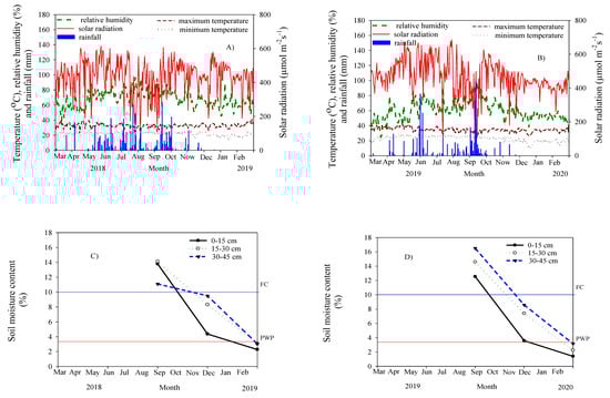 Weather conditions for 2018/2019 (A) and 2019/2020 (B) at Khon Kaen University, Thailand. Soil moisture contents at three different soil depths for 2018/2019 (C) and 2019/2020 (D) (FC = field capacity and PWP = permanent wilting point).