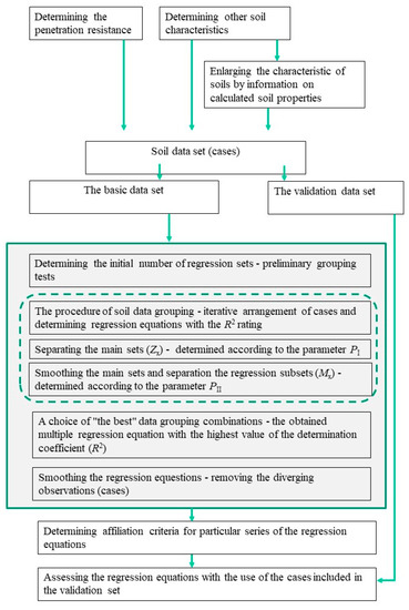 The aim of the work was to develop the method of soil data grouping (DGM) enabling the selection of regression equations to predict penetrometric resistance. Models that were useful in practice were sought, enabling estimation of the current value of penetrometric resistance on the basis of an easily available and small set of input data, the acquisition of which does not require complicated experimental research. A simplifying assumption was made that the strength of soils with similar intrinsic properties depends on soil moisture and bulk density. This approach allows one to omit other factors that affect penetrometric resistance, e.g., soil depths, soil type, sampling time etc. Due to the fact that it is difficult to choose the same prognostic model for cultivated and uncultivated soil [19], the research was limited to the subsoil layer of soils.