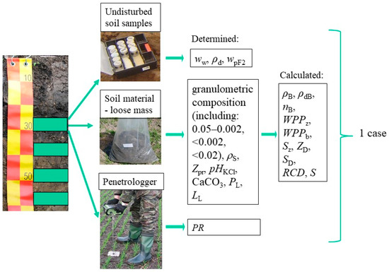 The development of the data grouping method started with the collection of experimental data. Experiments were performed on plastic soils of the Szczecin Lowland, north-west Poland. Soil material was taken from 13 sites. On each site, 1 or 4 profiles of soil pits were described, in which the first planned measurements were carried out—a total of 43 profiles. In the following years, measurements were repeated in soil pits, 2 to 3 m apart from each of the previously described profiles—a total of 57 pits. The measurements were carried out in the spring time (24 March–10 May) and in autumn (27 September–14 December), in a non-tilled sub-soil layer, at depths of 25–30, 35–40, 45–50 and 55–60 cm. In the sites where ploughing was performed to a depth of 30 cm, a layer of 25–30 cm was omitted.