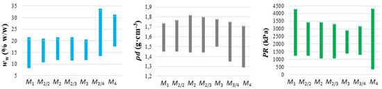 Figure 6 shows the obtained values of the independent (ww, ρd) and the dependent (PR) variables for individual subsets of data (Mx). The proposed method of data grouping caused a range of changes of independent variables in individual subsets of Mx. Significantly higher differentiation was obtained for subsets M3/4 and M4. For PR, larger value ranges occurred for subsets M1 and M4.