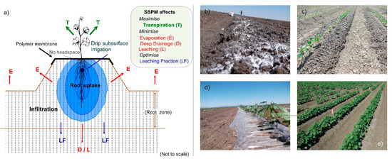 (a) Conceptual sketch of a sprayable biodegradable polymer membrane (SBPM)’s effect on relatively small-scale soil hydrology. (b) Soil after the application of SBPM_full spray-on, (c) SBPM_gap plot, (d) oxo-degradable plastic (ODP) slotted mulch film plot, (e) experimental layout in the field during October/November 2015 at the Australian Cotton Research Institute (ACRI), Narrabri.