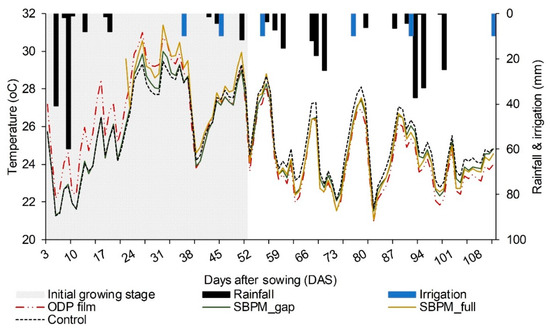 For the seedbed temperature measurements (at 10 cm), an additional plot with spray-on SBPM applied over the plant line (SBPM_full) was also included. Seedbed temperatures were slightly elevated under the ODP film and SBPM early in the season, a similar response to that observed in previous studies using thin plastic mulch film, which enables earlier planting or planting in cooler regions in Australia [21]. The SBPM_gap increased soil temperature compared to the control, but only between 21 and 38 days. It was observed that the soil temperature was lower in the treatments that took place later in the season, which was probably the result of increased soil moisture during the treatments. Similar results have been reported for cotton grown under PE film when compared with planting on non-mulched soil [6]. These studies used either non-degradable plastic or oxo-degradable plastic films which, contrary to the SBPM technology, could pose a threat to the environment in terms of the retrieval of the plastic film and soil and water pollution [22]. This preliminary study looked at the potential to incorporate SBPM technology into the existing Australian cotton (and similar) production systems where cotton is mechanically planted on raised beds and irrigated with flood–furrow irrigation. Implementing SBPM to conserve soil moisture may improve crop water productivity, with the ease of spray application and no environmental pollution or disposal costs [11,12]. The SBPM_gap treatment showed that it may have the potential to improve CWP, but the application rate and coverage width still need to be optimized to minimize production costs, while enhancing growing benefits. Research is ongoing to achieve this result. As the plant line had to be left uncovered for the seeds to emerge, the SBPM_gap application technique probably limited the full agronomic potential of SBPM cover.