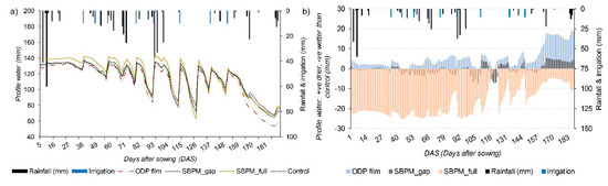 (a) The effect of oxo-degradable plastic (ODP) mulch film and sprayable biodegradable polymer membrane (SBPM_gap and SBPM_full) treatments on cumulative soil profile water content (mm) during the cotton growing season 2015/2016 at the ACRI field site (n = 10 plots; SBPM_full not replicated); (b) the comparison of soil profile water under the ODP, SBPM_gap and SBPM_full treatments, shown in relation to the control: positive is drier and negative is wetter than the control.