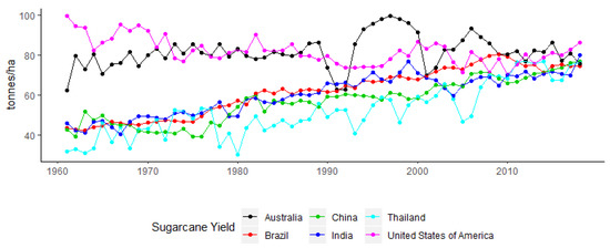Sugarcane yields in Brazil, India, China, Thailand, Australia, and the United States of America from 1960–2018.