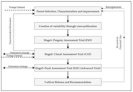 To initiate a breeding cycle, parental clones are selected from a source population that has been characterized for key major commercial and agronomical traits, such as tones cane per hectare (TCH), sugar content measured as commercial cane sugar (CCS), fiber content and resistance to important diseases in the target environments. These parental clones may be sourced from intra- or inter-national breeding programs. The selected clones are crossed to create a large number of seedlings that are tested as families and then clonally propagated and selected throughout the remaining phenotypic testing phases [51] (Figure 2). Finally, the clones used as crossing parents are assessed based on the performance of their progeny. If the progeny performs relatively well, the corresponding crossing parents and the cross will be identified as “proven parents” and “proven cross,” respectively, and may be used repeatedly to produce thousands of offspring that undergo selection.