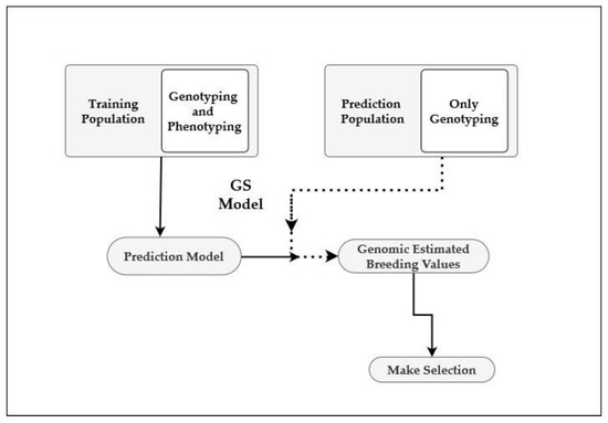 The fundamental requirement for GS to work is that quantitative trait loci (QTL, the actual mutations) that are affecting the expression of the target trait are in LD with the DNA markers that are used for genotyping [72,75]. If this requirement is met, trait effects for DNA markers can be estimated and used in the prediction equation. In the second step, these marker effects are used to calculate the genomic estimated breeding values (GEBVs) of selection candidates (prediction population; PP) for which only genome-wide marker data (but no phenotypic data) are available. Genotypes can then be ranked based on their GEBVs to support selection decisions in a breeding program.