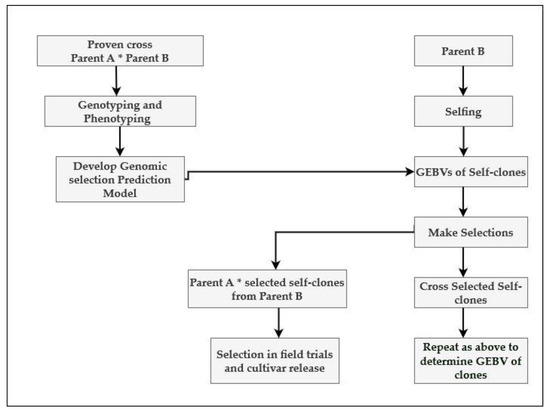 Considering the importance of specific along with general combining ability effects in determining the performance of crosses, implementation of a modified version of RRGS, as shown in Figure 5, might improve long-term genetic gain in hybrid sugarcane breeding. Such a breeding scheme could begin with developing a genomic prediction model by using a reference population comprising a large number of progeny generated from a proven cross, say A × B where parent A and parent B are unrelated. One of the parents (e.g., parent B) and its derived self-progeny would be selected based on the predicted breeding value using a previously developed genomic prediction equation. If selfing is not feasible, very closely related clones (e.g., from one family) could be used instead. Several self-clones derived from parent B with high predicted breeding value would then be crossed with the opposite parent (Parent A). Potentially, the new crosses from the selected self-clones are better than the original high-value cross because of the improved genetic merit of the B-derived clones. The selected self-clones could also be crossed together and undergo further ongoing improvement cycles via rapid RGS. A similar breeding system could be initiated with a small number (2 or 3) parents on one, or both A and B sides (rather than single parents as in Figure 5), and progeny derived from crossing parents on one side would be selected for high predicted breeding values before crossing them with the opposite side. Extending the theory from Cheverud and Routman (1996) to a situation in which a quantitative trait is controlled by many epistatic QTL, in a modified RRGS breeding scheme, the QTL alleles in the opposite heterotic group could be fixed (remain unchanged). This could result in a genetic model with increased additive genetic variance and reduced statistical epistasis. This could contribute to an increase in predictability, leading to improved selection efficiency and higher genetic gain.