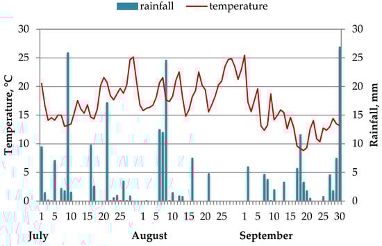 The climate in this region is temperate humid, with annual total precipitation around 587.5 mm and a mean annual air temperature of 7.9 °C (data for the years 1981–2015). Weather conditions of the July–September 2019 period are presented in Figure 1. High air temperature in combination with small rainfall before sampling in August could have reduced earthworm activity and biomass. In September, the rainfall and temperature were more favorable for earthworms [41].