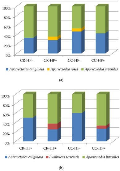 Relative abundance (%) of earthworm species (based on individuals m−2) on (a) spring barley and (b) faba bean (B) fields; CR—crop rotation, CC—continuous cropping, HF−—no plant protection, HF+—herbicide + fungicide.