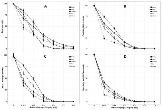 Dose-response effects of trifluralin on shoot parameters (A. Emergence; B. Plant height; C. SPAD index; D. Shoot dry weight) of barley, lentil, lucerne, oat and wheat at 28 days after sowing (DAS). Lines denote predicted responses according to the equations reported in the materials and methods section. Symbols shown on the graphs are the original means of each parameter (% control) against each dose of trifluralin concentration. Mean value was pooled from eight observational units.
