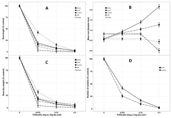 Effect of various levels of trifluralin concentrations on root parameters (A. Root length; B. Mean root diameter; C. Root dry weight; D. Number of nodules) of barley, lentil, lucerne, oat and wheat at 28 days after sowing (DAS). Lines denote predicted responses according to the equations reported in the materials and methods section. Symbols shown on the graphs are the original means of each parameter (% control) against each dose of trifluralin concentration. Mean value was pooled from eight observational units.