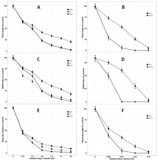 Dose-response assay of atrazine concentrations on plant height (A. barley, wheat and oat; B. lentil and lucerne), SPAD index (C. barley, wheat and oat; D. lentil and lucerne) and shoot dry weight (E. barley, wheat and oat; F. lentil and lucerne) at 28 days after sowing (DAS). Lines denote predicted responses according to the equations reported in the materials and methods section. Symbols shown on the graphs are the original means of each parameters (% control) against each doses of atrazine concentration. Mean value was pooled from eight observational units for wheat, barley and oat; whereas four observational units for lentil and lucerne.