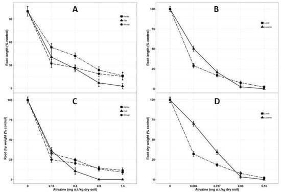 Effect of different levels of atrazine concentrations on root length (A. barley, wheat and oat; B. lentil and lucerne) and root dry weight (C. barley, wheat and oat; D. lentil and lucerne) at 28 days after sowing (DAS). Lines denote predicted responses according to the equations reported in the materials and methods section. Symbols shown on the graphs are the original means of each parameter (% control) against each dose of trifluralin concentration. Mean value was pooled from eight observational units for wheat, barley and oat; whereas four observational units for lentil and lucerne.