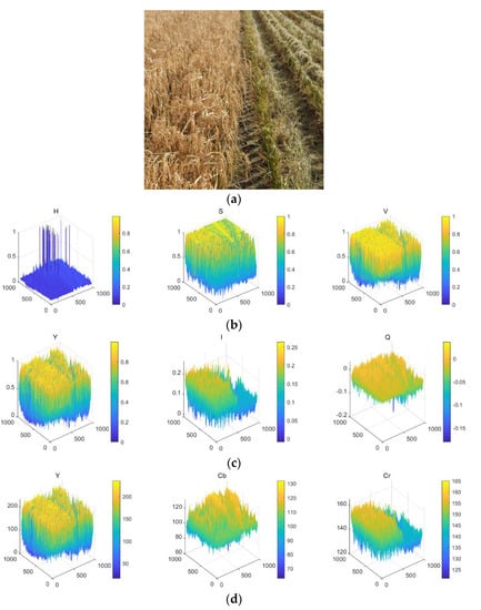 The RGB images collected by the camera were converted to color spaces containing separate brightness components such as the HSV, YCbCr and the NTSC so that the effects of the light changes and shadows could be reduced []. Take Figure 2a as an example to view the different components in each color space. The results are shown in Figure 2b–d.