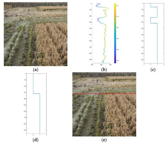 If there were two uncut areas at the far end of the image (Figure 4a), the area to be processed needed to be selected. According to the prior conditions, there was only one cut-edge at the near end of the image, which could be used to decide whether the uncut area was on the left or the right side. Then, the crop rows at the far end were selected. Both the bottom and the top of the image were vertically projected. Since it was not a necessity to do an accurate selection of the target edge, which could be included in an approximate region, the number of projection rows was set to 100 to meet the need of reducing the effect of noise.