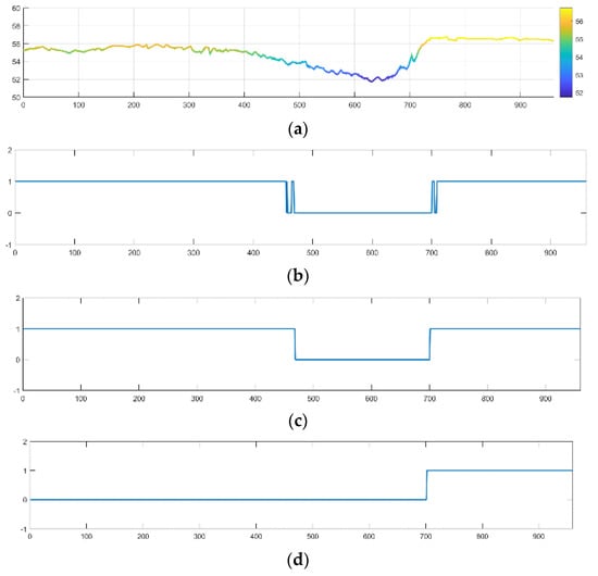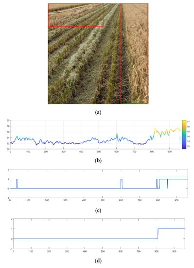 Figure 4b shows the result gained from the projection of the bottom, which, after shaping, turned into those data illustrated in Figure 4c. A threshold value of 20 was set according to experience to eliminate noise. Figure 4d shows the result when shorter fluctuations with periods less than 20 are removed. This method can separate cut/uncut areas.
