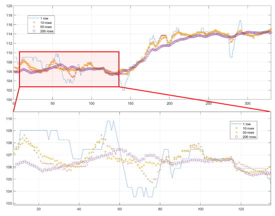 The crops were projected in 1 row, in 10 rows, in 50 rows and in 200 rows, respectively, and the results were normalized to get Figure 7. The results indicated that the uncut area was the higher part of the graph. When the number of the projected rows climbed, the consistency of the cut area increased accordingly, while the accuracy was reduced. The number of projected rows was therefore set to 10 to realize the trade-off between the computational cost and the accuracy of discrimination.