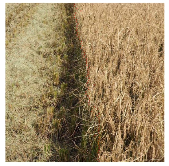The stereo-vision-based method uses the height difference between the crops and the land to identify crop rows []. Although this method is not affected by shadows, it only works for tall crops and cannot effectively identify crop rows cut by a semi-feeder harvester.