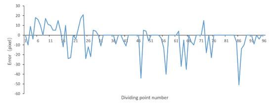 Twenty images were extracted for the dividing points. The deviation was calculated by comparing the manually marked dividing point with the predicted point. The error statistics for locating the cut-edge of one of the images are shown in Figure 13.