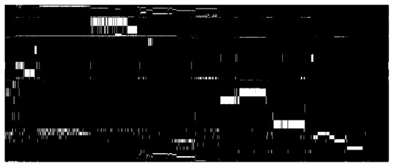 Uneven phenotyping in United States sorghum collection. Columns contain 2378 accessions with genomewide SNP data. Rows contain one trait measured in one study (787 rows). The same trait may occur multiple times in the matrix, measured in independent studies. White indicates a measurement, black, missing data. Horizontal white traces indicate traits that have been measured for many accessions in a single study. Vertical traces mark accessions that have been measured for many traits.