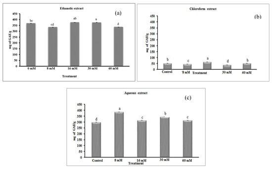 On top of that, the plant treated with 8 mM showed the highest total phenolic content (Figure 3c) for aqueous extract with a value of 385.66 mg of GAE/g. The second highest was the plant treated with 30-mM H2O2 (345.22 mg of GAE/g); there was no significant difference between 16 mM and 60 mM. The lowest value of total phenolic content was 298.62 mg of GAE/g (control plant). From the results stated above, it is clear that the phenolic content was higher in ethanolic and aqueous extracts than in the chloroform extract. Therefore, H2O2 affected the phenolic content in F. deltoidea.