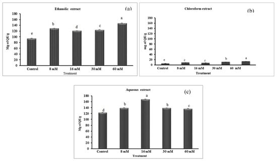 Total flavonoid content of chloroform extract is shown in Figure 4b. The result indicates that there was a significant difference between all untreated and treated plants. The plant treated with 60 mM showed the highest amount of total flavonoid content (13.56 mg of QE/g), followed by 30 mM (11.53 mg of QE/g). The lowest total flavonoid content was 5.55 mg of QE/g (control).