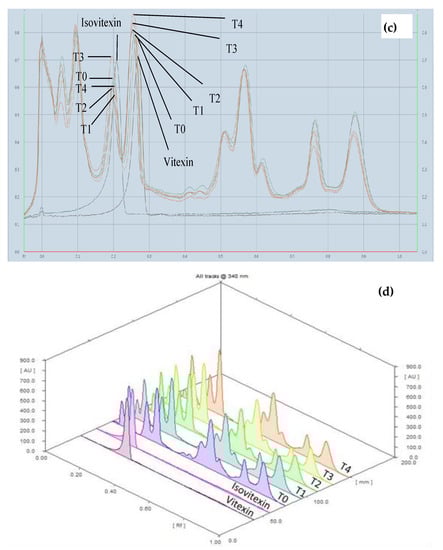 In addition, the intensity of the compounds varied between treated and untreated plants. Figure 5c,d show the 2D and 3D densitogram of the HTPLC analyses. First, the vitexin compound in untreated plants (T0) shows the lowest band of intensities and the treated plants show a greater intensity of band color. It is also clear that the intensity is dependent on the treatment dose of the H2O2. Although unlikely, the isovitexin compounds appear as an opposite trend, i.e., 30 mM (T3) produced the strongest intensities and 8 mM (T1) the weakest. However, the untreated plants (T0) show the second strongest band of intensity after 30 mM.