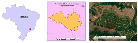 The experiment was completed at Farm Samambaia, located in the municipality of Santo Antônio do Amparo, Southern Minas Gerais, Brazil, in a 3 ha field within a coffee (Coffea arabica L.) plantation of the cultivar Acaiá 479–19, with geographic coordinates 20°58′10” S and 44°53′35” W (Figure 1).