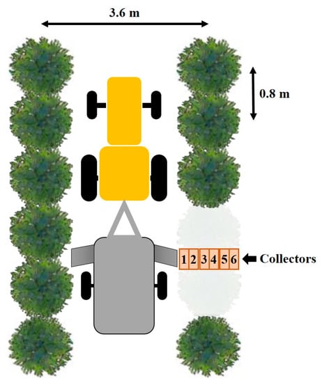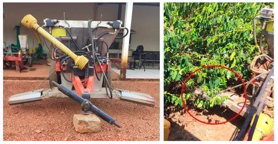 The machine evaluated was a spreader for the distribution of fertilizers and soil correctives, equipped with a VRA system adapted by Barros et al. (2016) [13]. The spreader had a load volume of 1.2 m3, with a length of 3.36 m, a height of 1.40 m and a total width 2.15 m including deflectors. The product dispenser mechanism consists of two independent conveying chains and manually adjusted gates. The application rate changed with variations in the conveyor speed, which is powered by hydraulic motors. In this system, the oil reaching the motors comes from a pump activated by the power take off of the tractor and the flow rate is controlled by electrohydraulic valves connected to the control system. The control system identifies the machine speed through a GNSS receiver and sends a signal to the electrohydraulic valves, aiming to maintain the pre-imposed application rate, independently of the machine speed. The distribution mechanism is composed of two horizontal disks with a 0.3 m diameter and four flaps per disk. The disks are activated individually by hydraulic motors fed by the oil flow from the tractor hydraulic system; the motor speed can be changed through a flow control valve located in the machine. The fertilizer application is directed to the planting row by lateral deflectors. In our study, the height of the external part of the deflectors was fixed at 0.23 m from the terrain for all evaluations. The machine and its interaction with the coffee plants are presented in Figure 2.