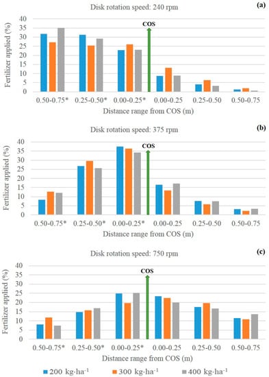 Transverse distribution profile histograms showing the percentage of fertilizer applied to different distance ranges from the coffee plant’s orthotropic stem (COS) for application on one side of the coffee plants (FA1) at three fertilizer doses and three spreading disk rotation speeds: (a) 240 rpm; (b) 375 rpm; (c) 750 rpm. * Positions located on the side of the coffee plants where the spreader travels when applying fertilizer.