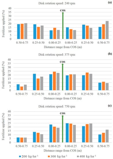 The distribution profile histograms for the operating mode FA2 are presented in Figure 5. At 240 rpm (Figure 5a), the fertilizer distribution was more uniform across the different distance ranges from the COS, although less fertilizer was applied to the strip closest to the COS. When the disk rotation speed was increased to 375 rpm (Figure 5b), the percentage of fertilizer applied closer to the COS increased. At 750 rpm (Figure 5c), the same trend of higher fertilizer application close to the COS was observed, but the right side of coffee plants received more fertilizer.