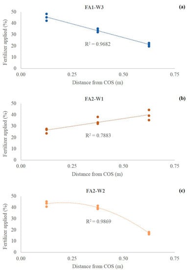 For treatment FA2-W2 (Figure 6c), a second order polynomial was fitted. Most of the fertilizer was therefore distributed on the strips between 0 and 0.25 m and 0.25 and 0.50 m from the COS, with a lower percentage (16.98%, on average) distributed on the strip between 0.50 and 0.75 m.
