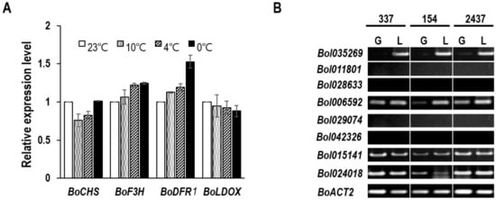 The presence of several DFR genes with differential expression under different abiotic stresses is suggested to have functional implications [49]. Based on the DFR sequences of Chinese cabbage, we identified eight putative DFR genes in cabbage (http://brassicadb.org/brad/) (Table S4) and investigated their expression by semi-quantitative RT-PCR in three HAA genotypes (337, 154, and 2437) under LT (Figure 1B). In these genotypes, three putative BoDFR genes (Bol006592, Bol015141, and Bol024018) were expressed constitutively, whereas four genes showed no expression; only one gene (Bol035269) showed LT-dependent expression (Figure 1B). An ortholog of Bol035269 (Bo9g058630) was identified in B. oleracea var. oleracea (http://plants.ensembl.org/Brassica_oleracea/Info/Index), which is hereafter referred to as BoDFR1. The expression of BoDFR1 was then studied in various cabbage genotypes exhibiting differential anthocyanin accumulation under LT.