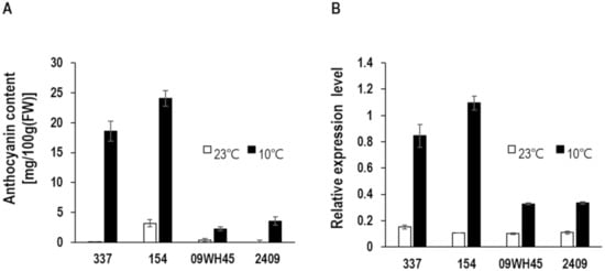 Initially, we focused on six inbred lines, three of which accumulated anthocyanins to high levels under LT (HAAs: 337, 154, and 2437) but three to show low levels (LAAs: 09WH45, 842, and 2409). Based on RT-PCR results (data not shown), we selected four inbred lines, including two HAAs (337 and 154) and two LAAs (09WH45 and 2409), for further analyses. First, we examined the level of anthocyanins and BoDFR1 expression in these lines grown at LT (<10 °C) for at least 30 days in a growth chamber. Upon LT exposure, anthocyanin content increased 4-10-fold in both HAA genotypes, and this increase was proportional to the increase in BoDFR1 expression (5.5-10-fold) (Figure 2). However, anthocyanin accumulation and BoDFR1 expression levels were not remarkable in the LAA genotypes.
