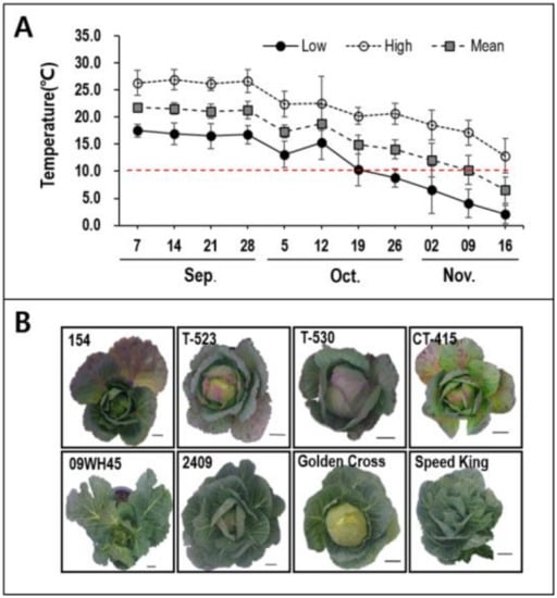Variation in temperature and anthocyanin content under the natural environment. (A) Temperature profile expressed as weekly average temperature (low, high and mean) from 7 September to 16 November under the natural environment. The daily low temperature in the field was below 10 °C during the last one month. Data represented mean ± SD (n = 7). (B) Variation in anthocyanin content in cabbage genotypes harvested on Nov. 16. The top four samples represent high anthocyanin accumulators (HAAs), and the bottom four samples represent low anthocyanin accumulators (LAAs).