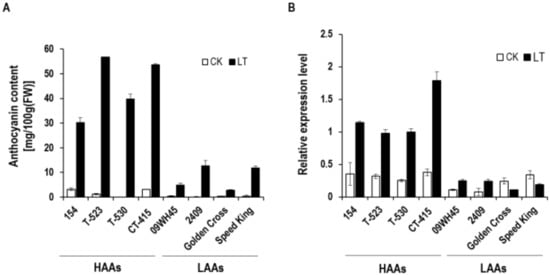 Analysis of anthocyanin content (A) and DFR1 expression (B) in cabbage genotypes shown in Figure 3. 154, T-523, T-530, and CT-415 are cabbages belonging to the genotype of HAAs and 09WH45, 2409, Golden Cross, and Speed King are cabbages belonging to the genotype of LAAs. Plants were grown in the greenhouse at temperatures ranging from 20 °C to 30 °C (control, CK) or at low temperature (LT) for one month. DFR transcript levels were measured by qRT-PCR. Data represent mean ± SD (n = 3).