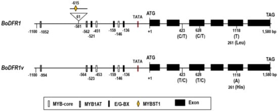 Schematic representation of the BoDFR1 and the BoDFR1v alleles identified in cabbage. The 1580 bp genomic DNA from ATG to TAG codon consists of six exons (black rectangles) and five introns (solid line). Locations of SNPs in the genomic DNA and putative transcription factor binding sites in the promoter are indicated. Analysis of cis-regulatory elements in the promoter region was performed using PlantPAN and PLACE databases. MYB-core, MYB-binding site; E/G-BX, bHLH-binding site; MYB1AT, MYB recognition site; MYBST1, Solanum tuerosum MYB-binding site 1.