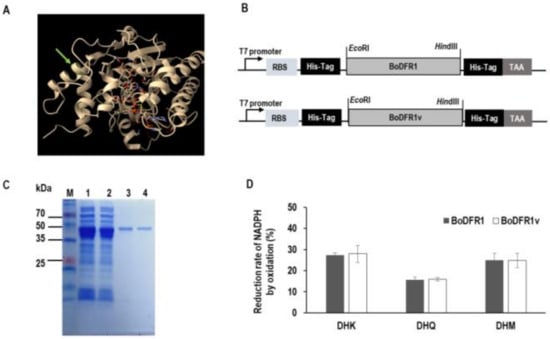 Production and activity of recombinant BoDFR1 and BoDFR1v proteins. (A) Predicted structure of BoDFR1 based on grape DFR crystal structure (PDB (protein data bank) ID: 2C29) [76]. The L261H amino acid substitution identified in Bol035269 is located in the α10 helix of the small C-terminal domain (green arrow). (B) Schematic representation of recombinant expression vectors. (C) SDS-PAGE analysis of recombinant proteins. Protein samples were separated on 10% polyacrylamide gels. M, protein marker. Lane 1, total lysate of pET-28a-BoDFR1; lane 2, total lysate of pET-28a-BoDFR1v; lane 3, purified His-tagged BoDFR1 protein; lane 4, purified His-tagged BoDFR1v protein. The molecular weight of BoDFR1 and BoDFR1v is 43 kDa. (D) Activity of BoDFR1 based on the oxidation of NADPH (Reduced nicotinamide adenine dinucleotide phosphate). The oxidation of NADPH was measured as the decrease in absorbance at 340 nm. DHK, dihydrokaempferol; DHQ, dihydroquercetin; DHM, dihydromyricetin.